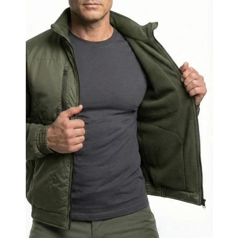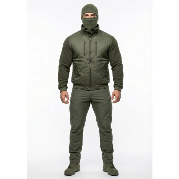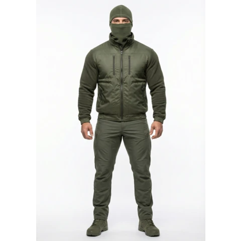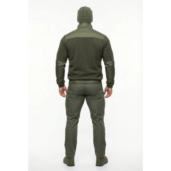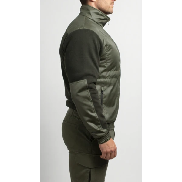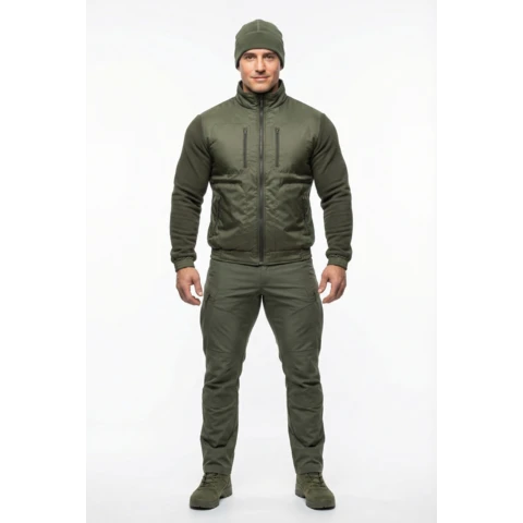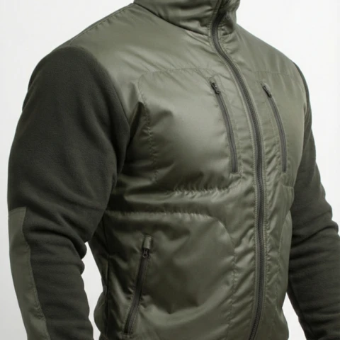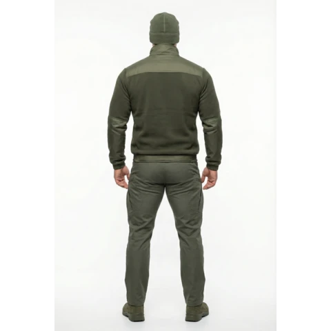 Куртка флисовая нового образца приталенного силуэта. Изготовлена из флиса 285 гр/м. с обработкой антипиллинг. На полочках куртки накладки из плащевой ткани с мембранным покрытием. 4 прорезных кармана с застежкой на тракторную молнию. Центральная застежка на тракторную молнию. На рукавах налокотники из плащевой ткани. Воротник из основной ткани. Манжеты и пояс на резинке.