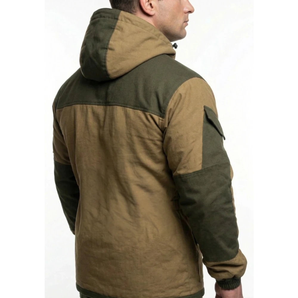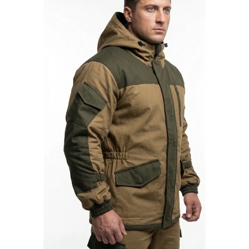 Куртка: свободного кроя, застёжка на молнию клапан на липе. Кокетка, накладки и карманы из отделочной ткани, 2 нижних накладных кармана с клапаном , с застежкой липу, на рукавах по 1 накладному наклонному карману с клапаном с застежкой на липу. В области локтя усиливающие фигурные накладки, предплечье стягивается резинкой, низ рукавов на резинке. Капюшон имеет утягивающую кулису для регулировки по объему, по линии талии стягивающая резинка.