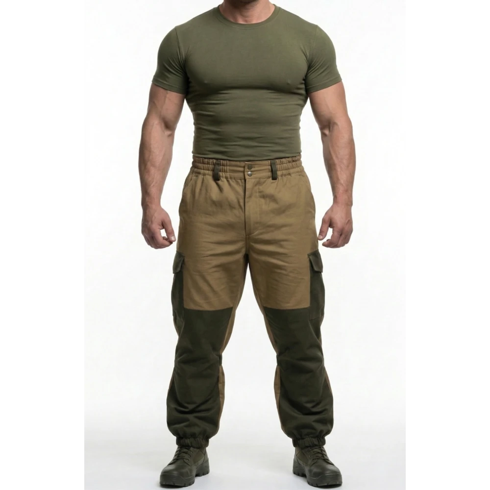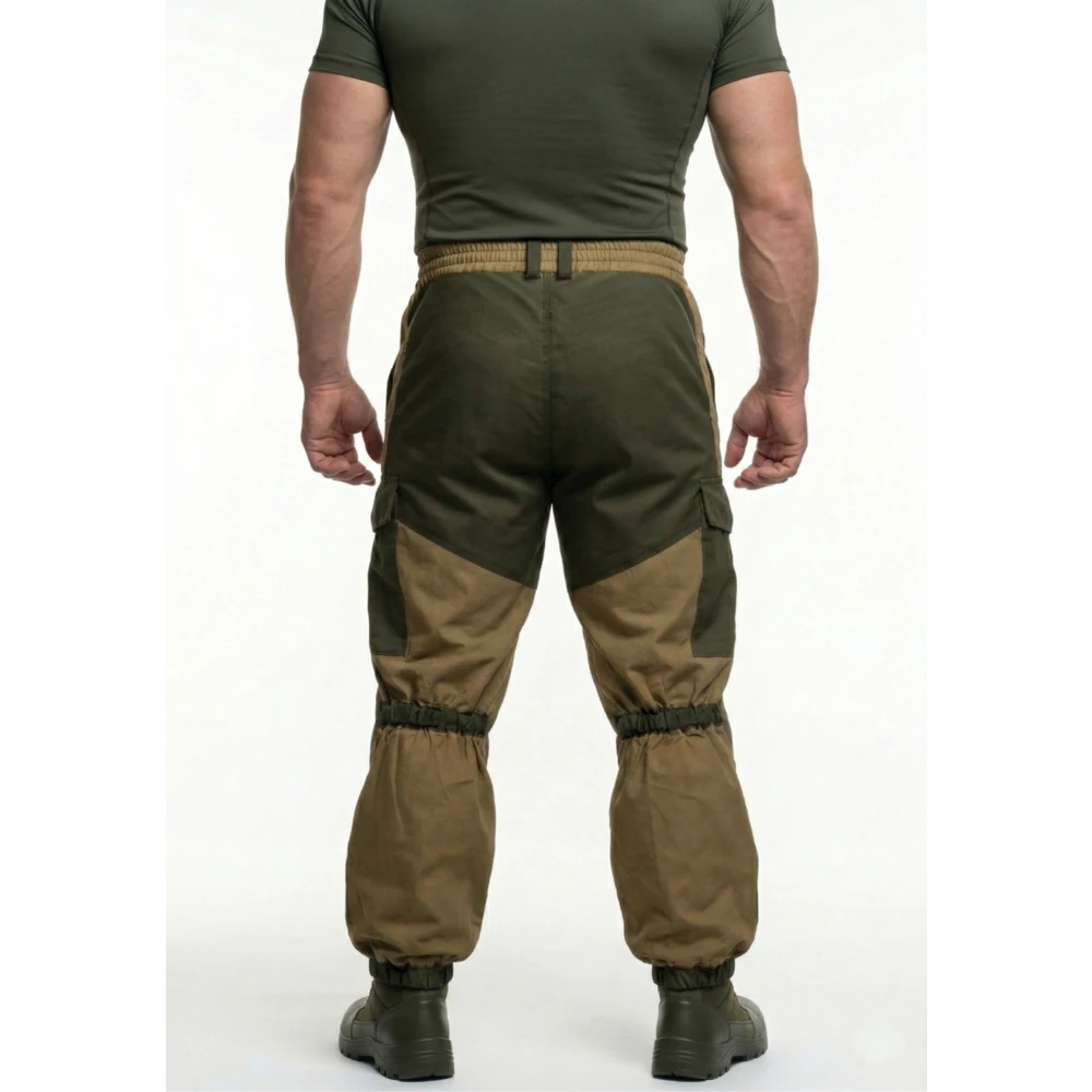 Брюки: свободного покроя, гульфик с застёжкой на молнию, 2 верхних прорезных кармана в боковых швах. 2 боковых накладных кармана с клапаном. Крой деталей в области коленей препятствует их вытягиванию. Задние половинки под коленом собраны резинкой. Пояс на резинке, низ на резинке.