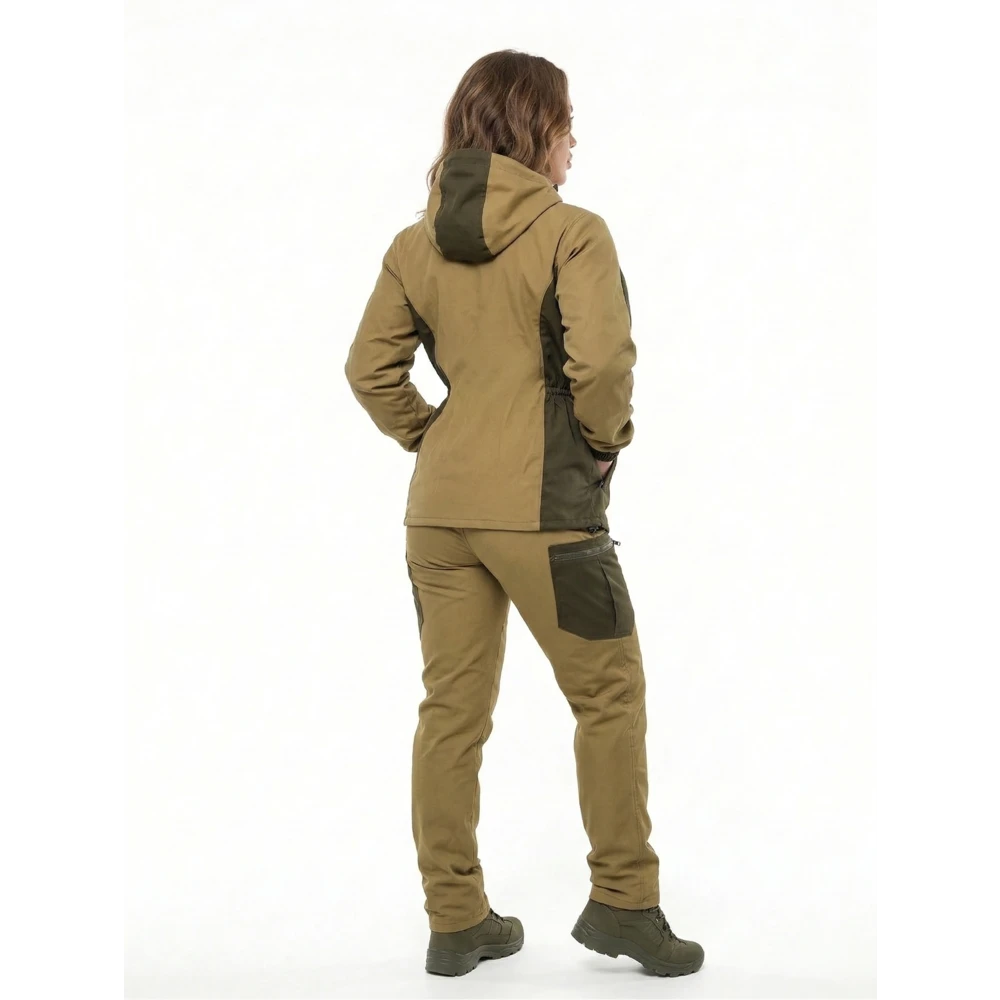 Куртка: свободного кроя, застёжка на молнию клапан на липе. Кокетка, накладки и карманы из отделочной ткани, 2 нижних накладных кармана с клапаном , с застежкой липу, на рукавах по 1 накладному наклонному карману с клапаном с застежкой на липу. В области локтя усиливающие фигурные накладки, предплечье стягивается резинкой, низ рукавов на резинке. Капюшон  имеет утягивающую кулису для регулировки по объему, по линии талии стягивающая резинка.