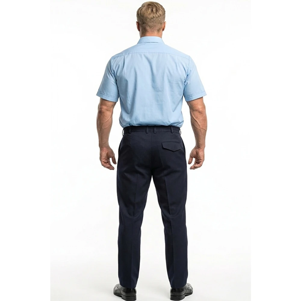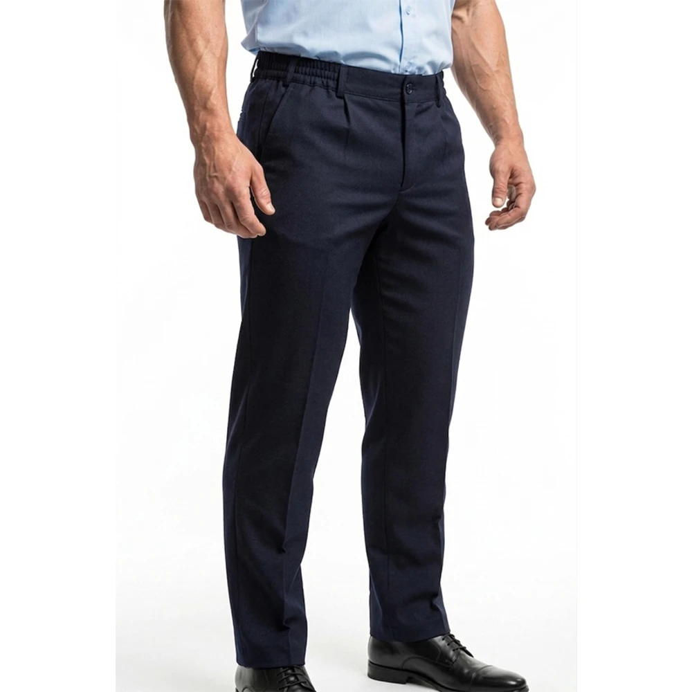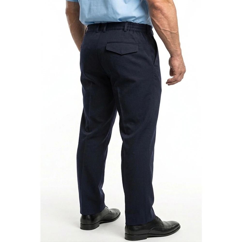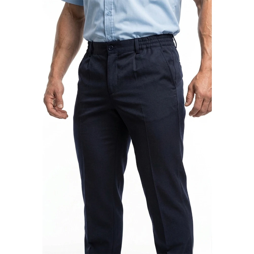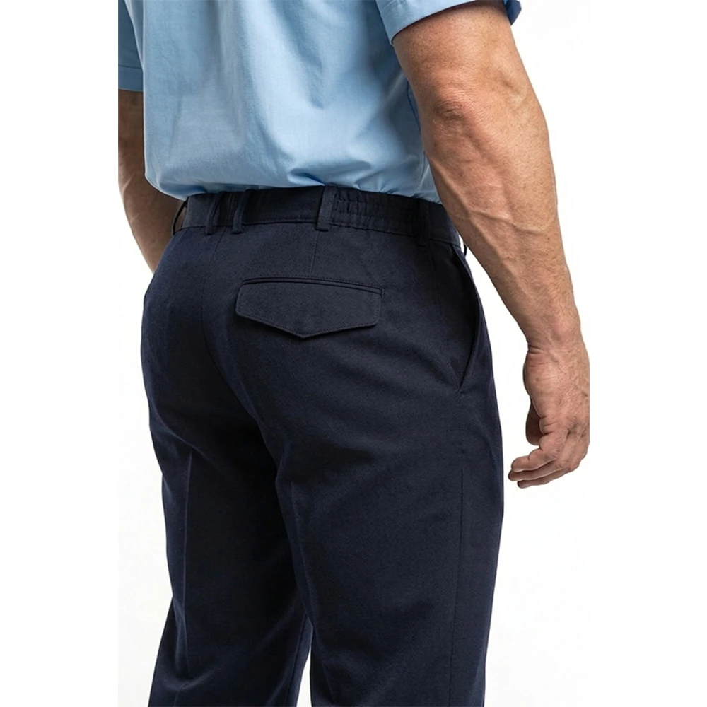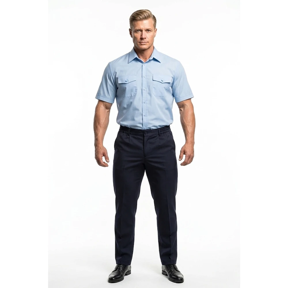 Брюки: - прямого силуэта, 2 передних "ленинградских" кармана, 1 задний прорезной карман листочкой, с фигурным клапаном с застежкой на липучку (по согласованию можно ставить петлю и пуговицу). Гульфик с застежкой на пуговицу и молнию. По бокам пояса вставки из резинки, 6 шлевок под ремень.